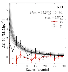 Combining weak-lensing measurements with photometric redshifts (photo-z’s) for the background galaxies, one can infer the mass of the cluster that acts as lens. Fig. 1 shows the mean tangential ellipticity, the primary weak-lensing signal, as function of separation from the Brightest Cluster Galaxy (BCG) of the cluster RXC J2248.7-4431 (z = 0.348). Also shown are 100 MCMC samples of Navarro-Frenk- White (NFW) profile fits to the data, a standard choice to describe the radial profile of dark matter haloes. The parameters of this model are the mass M200c enclosed in a given aperture, here within a sphere that contains 200 times to critical density of the universe at the redshift of the cluster, and the concentration c200c that describes the slope of the profile within the same aperture. The resulting fits yielded a cluster mass that was in good agreement with previously published results. Moreover, we could show that the cluster mass estimates remained unchanged when the weak-lensing measurements were done in any of the riz filters, demonstrating that all relevant instrumental effects were accounted for.