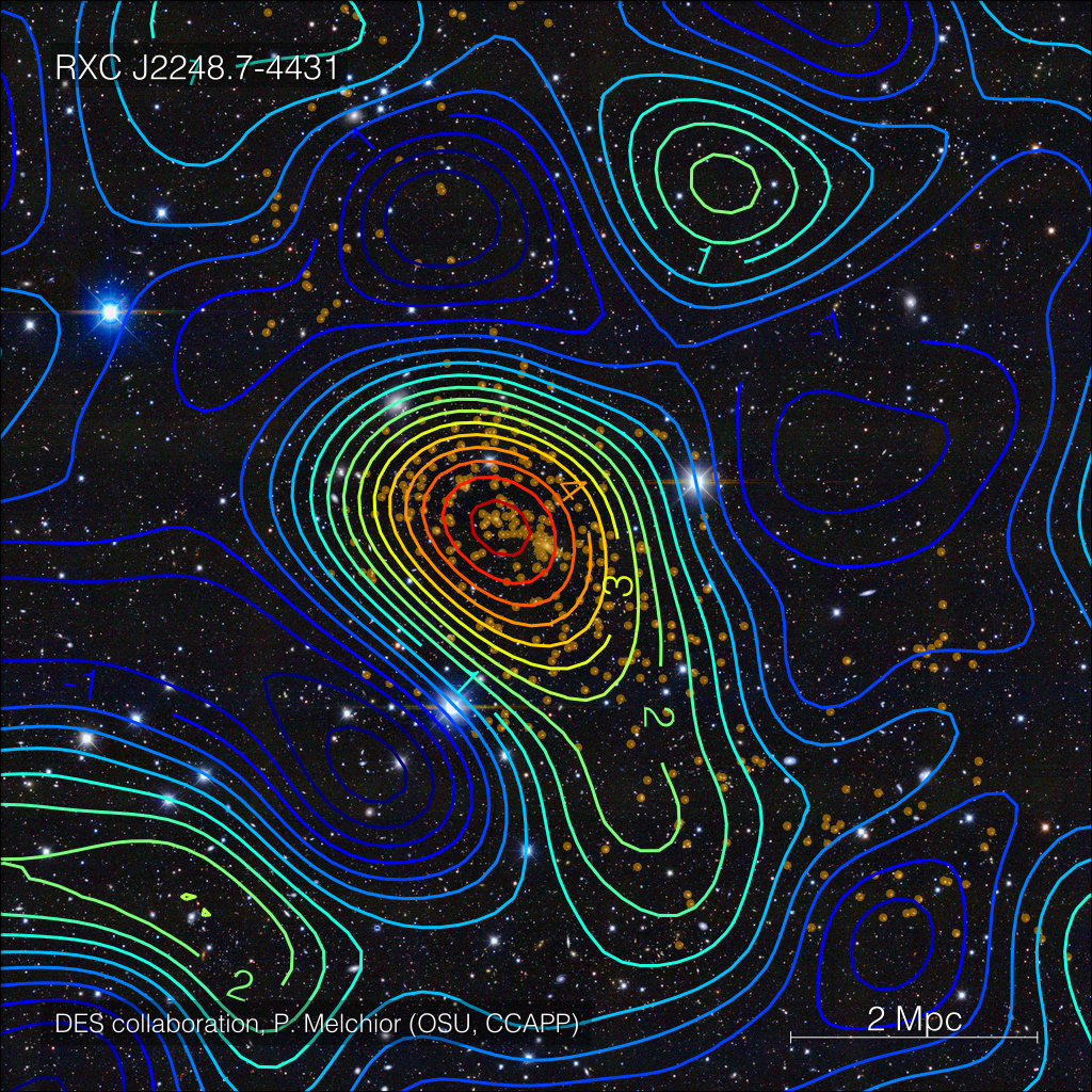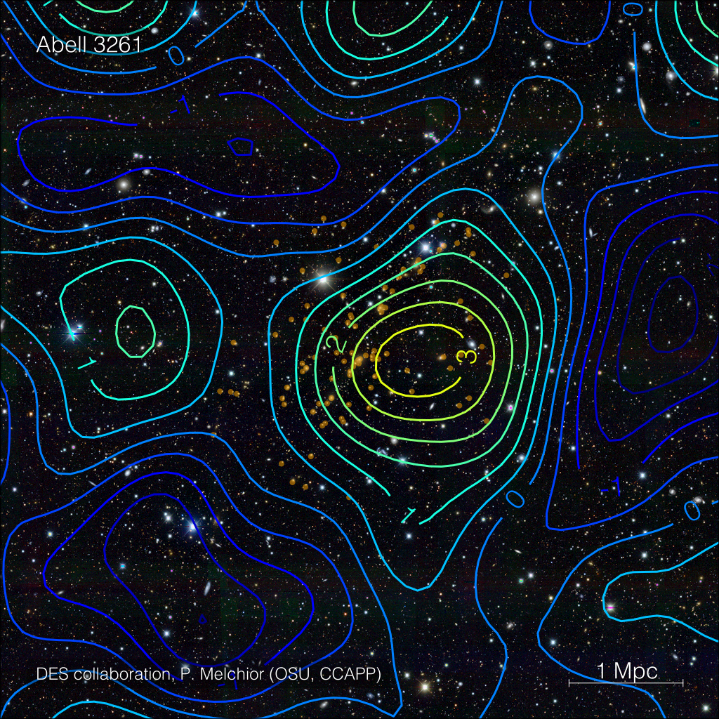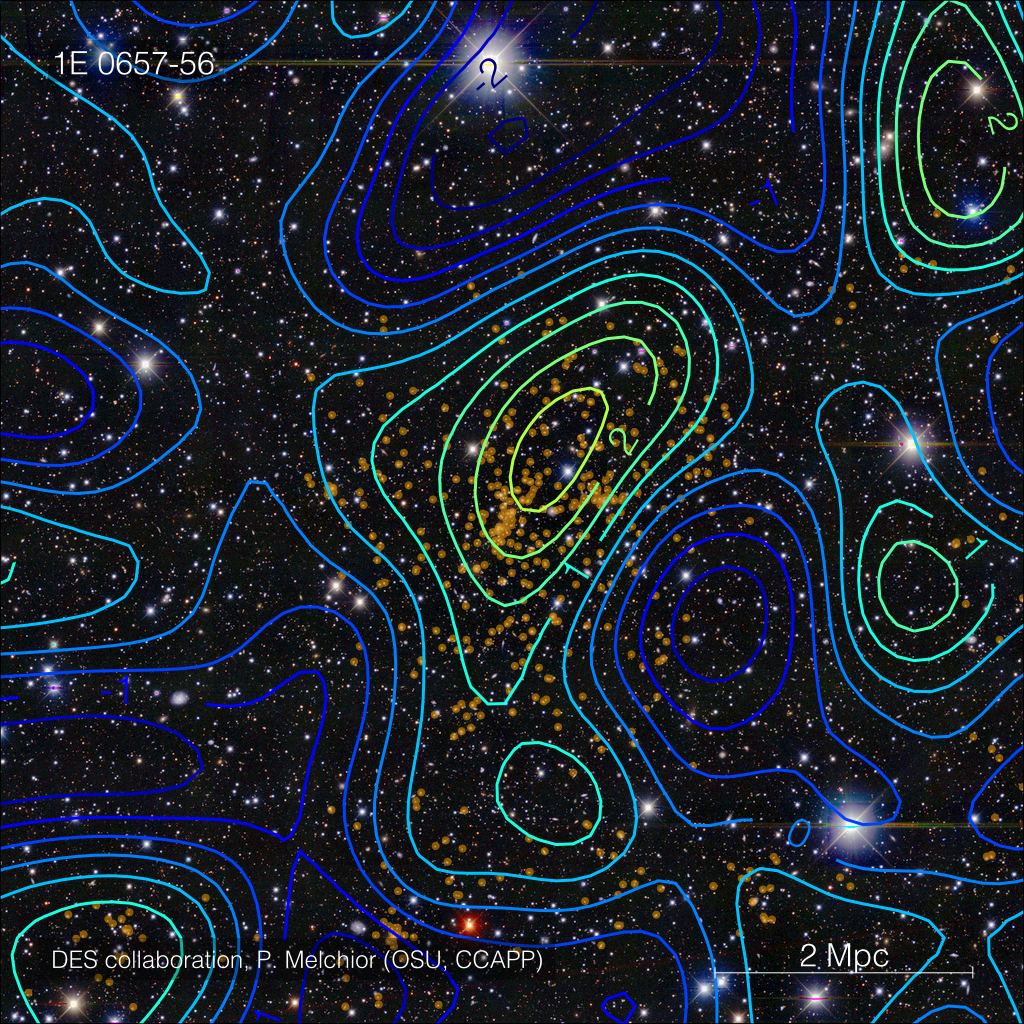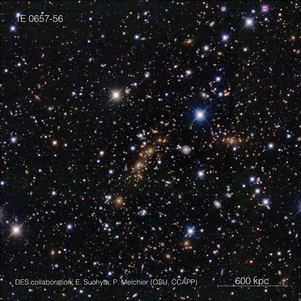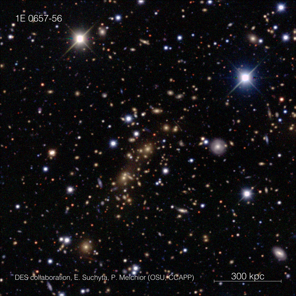 For the first paper with data from the Dark Energy Survey, I led a large team of DES collaborators and used the Dark Energy Camera (DECam) on the CTIO 4-m telescope to study four massive galaxy clusters. The targeted clusters were well known— one of them is the famous Bullet Cluster, the poster child of merging clusters—so that the findings from DECam data could be cross-checked with existing results. If this could be done successfully, it would not only validate the instrument and the DES analysis pipelines, but utilizing the entire 3 square degree field of view would also allow an investigation of the large-scale environment from which these clusters accrete their material.