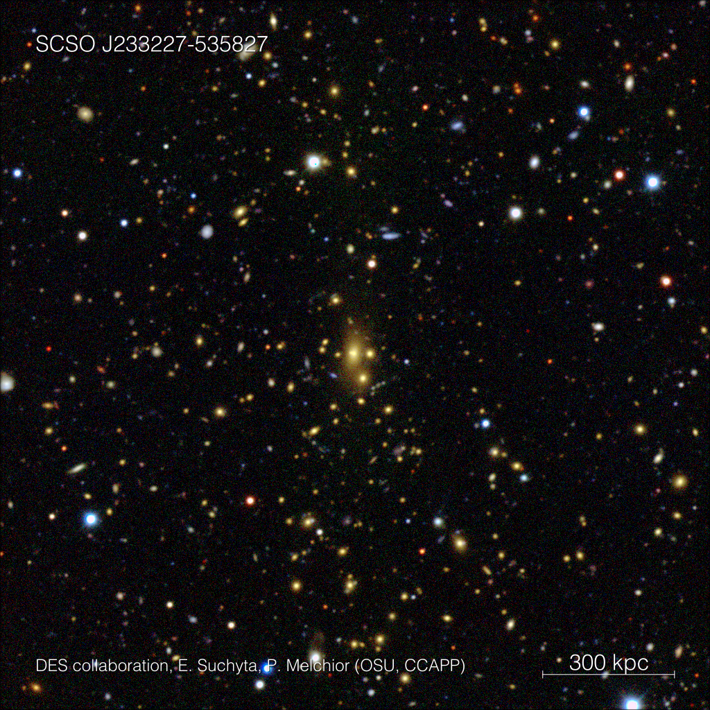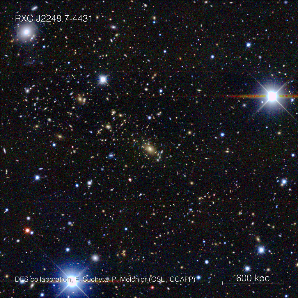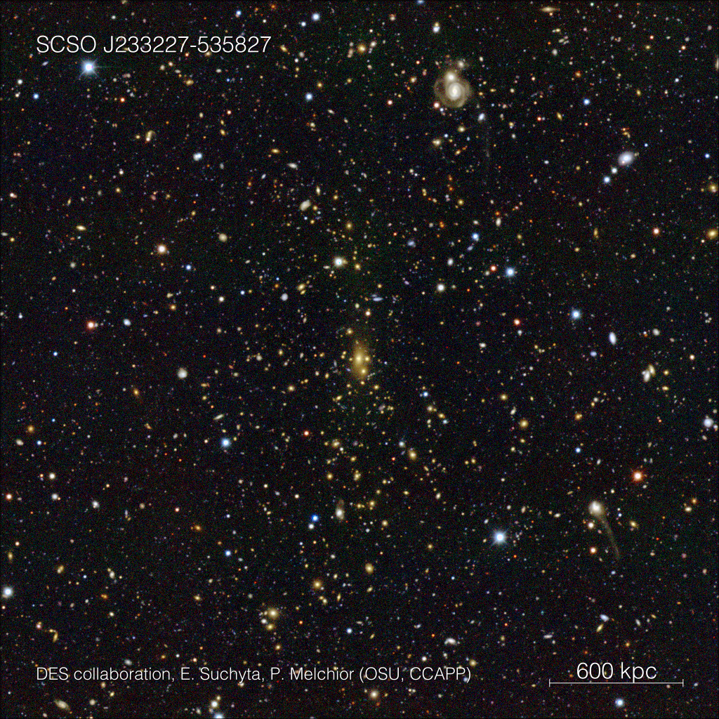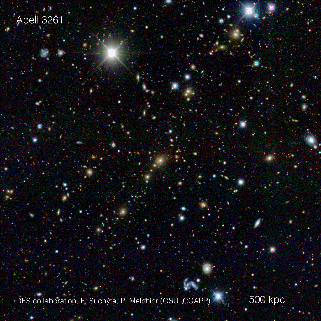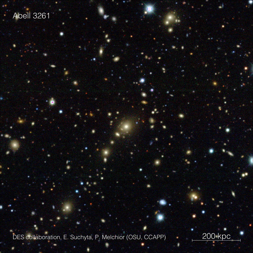 For the first paper with data from the Dark Energy Survey, I led a large team of DES collaborators and used the Dark Energy Camera (DECam) on the CTIO 4-m telescope to study four massive galaxy clusters. The targeted clusters were well known— one of them is the famous Bullet Cluster, the poster child of merging clusters—so that the findings from DECam data could be cross-checked with existing results. If this could be done successfully, it would not only validate the instrument and the DES analysis pipelines, but utilizing the entire 3 square degree field of view would also allow an investigation of the large-scale environment from which these clusters accrete their material.